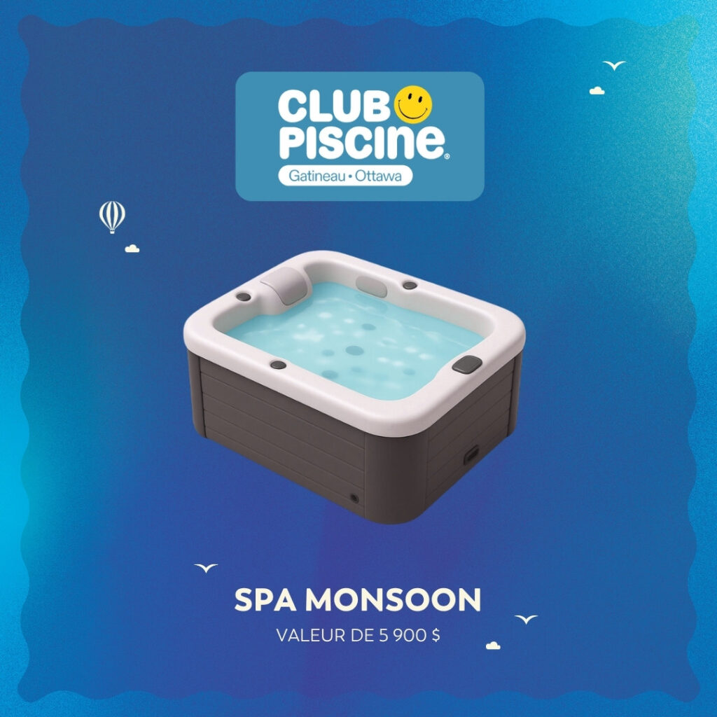 - Le 2e billet tiré donnera droit au deuxième prix, soit un (1) spa Monsoon, modèle 2025, de couleur graphite comprenant six (6) assises, dont le siège capitaine, et un (1) lit ergonomique permettant deux positions couchées et le siège de repos (un levier pour le couvercle et les marches pour le spa sont inclus), gracieuseté de Club Piscine. Valeur de 5900 $ + taxes.