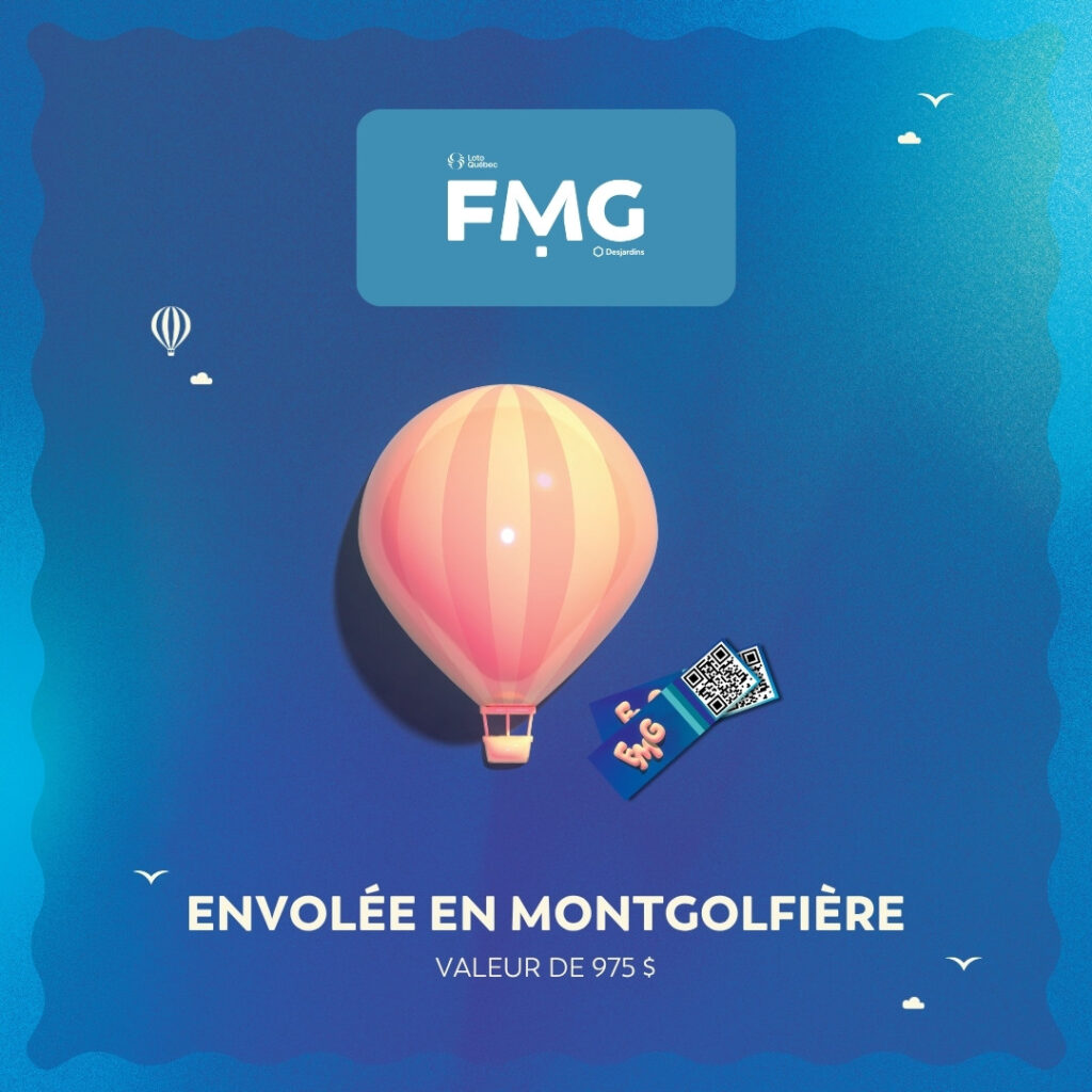 - Le 3e billet tiré donnera droit au troisième prix, soit une (1) envolée en montgolfière pour 2 personnes pendant le FMG 2026, incluant deux (2) passeports 5 jours pour le FMG. Valeur de 975 $ + taxes. En cas d’impossibilité à voler en 2026, ce prix est remis pendant la tenue de l’édition 2027 du FMG;