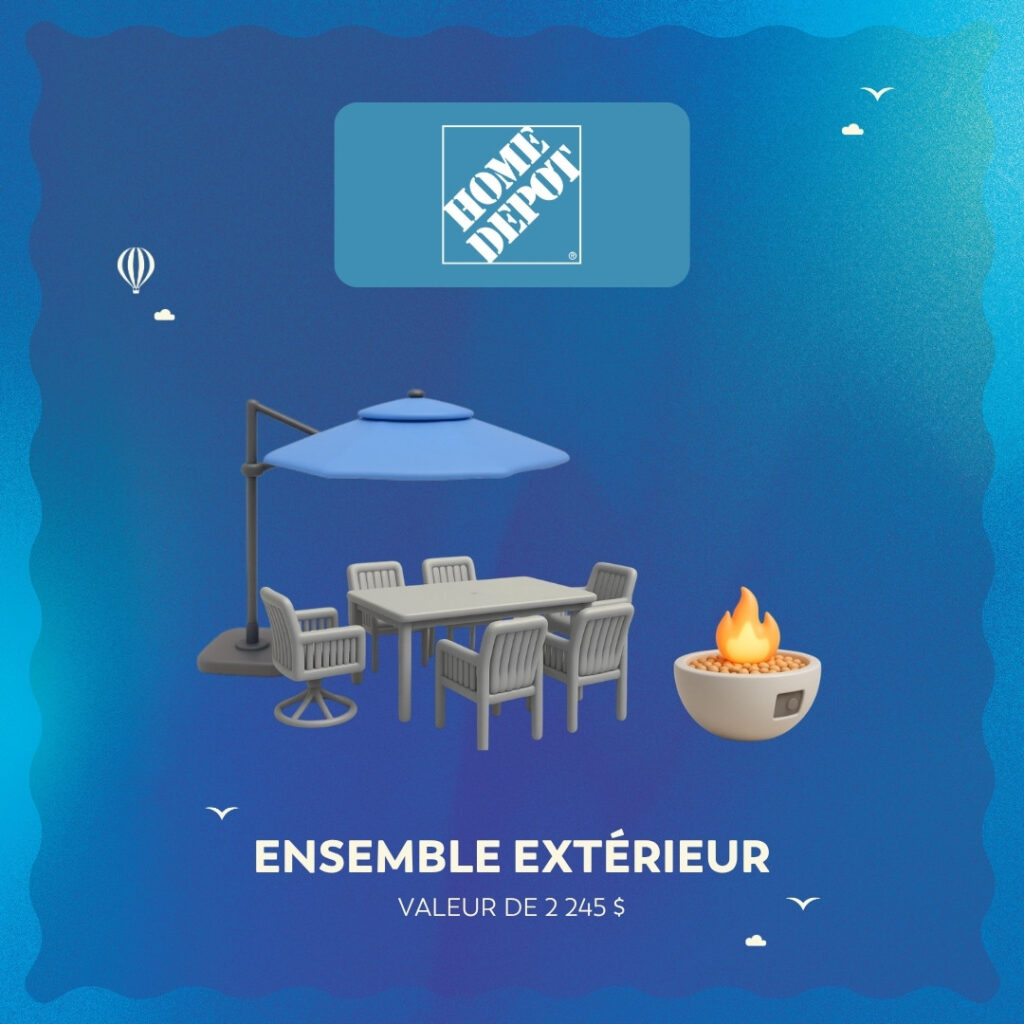 - Le 6e billet tiré donnera droit au sixième prix, soit un (1) ensemble extérieur de salle à manger, gracieuseté de Home Depot, comprenant un (1) parasol de terrasse déporté en aluminium de 3,35 mètres avec des barres lumineuses solaires, bleu, de marque Hampton Bay, un (1) ensemble extérieur de salle à manger de patio en osier à sept (7) pièces avec des coussins de couleur marron de marque Hampton Bay et un (1) foyer au gaz pour patio de 91,4 cm de marque Hampton Bay. Valeur de 2245 $ + taxes.