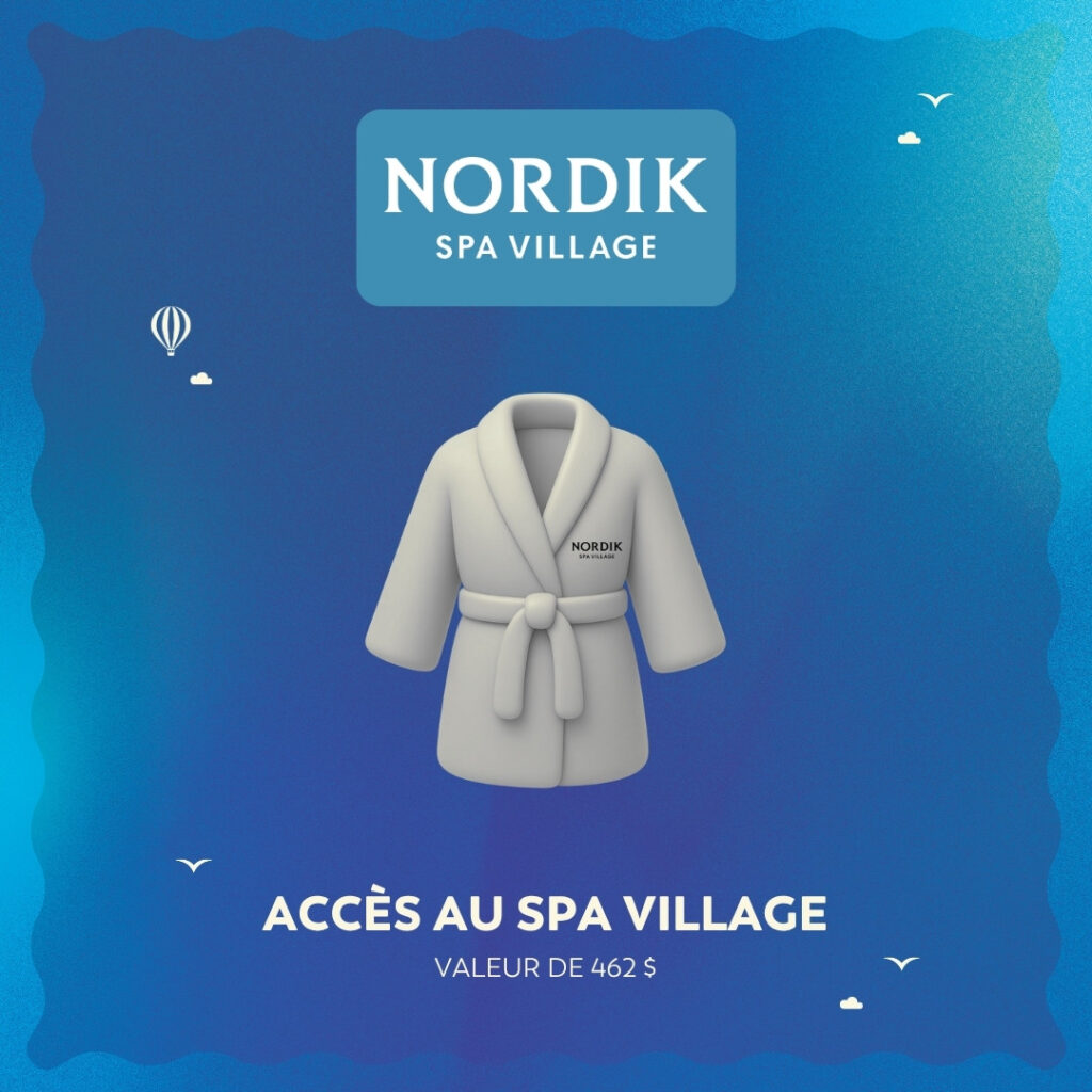 - Le 3e billet tiré donnera droit au troisième prix, soit deux (2) forfaits comprenant chacun un (1) accès au Spa Village (qui inclus le peignoir et les serviettes), ainsi qu’un (1) soin au choix (excluant le facial Lumea) chez Nordik Spa Village. Valeur de 462 $ + taxes;