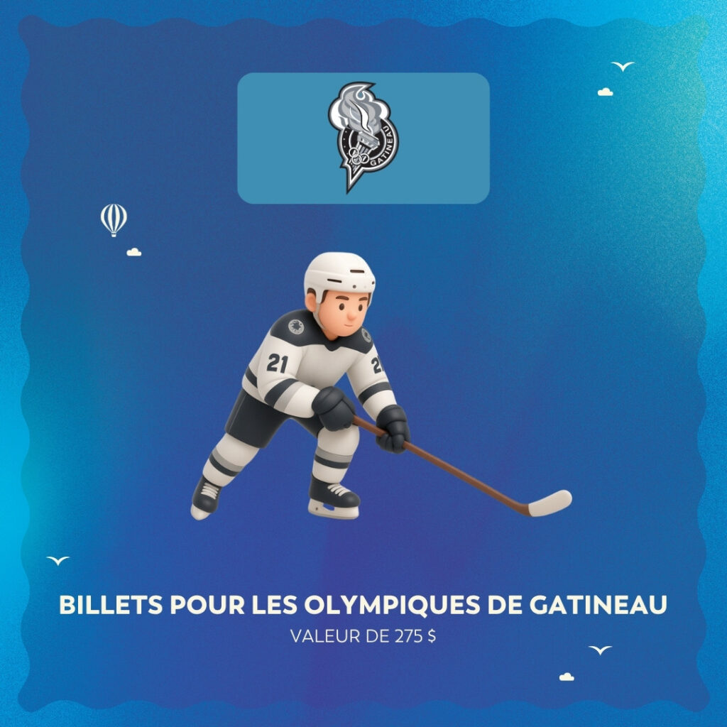 - Le 2e billet tiré donnera droit au deuxième prix, soit un (1) certificat-cadeau pour un livret Flex comprenant dix (10) billets pour la saison régulière 2026-2027 des Olympiques de Gatineau. Valeur de 275 $, taxes incluses;