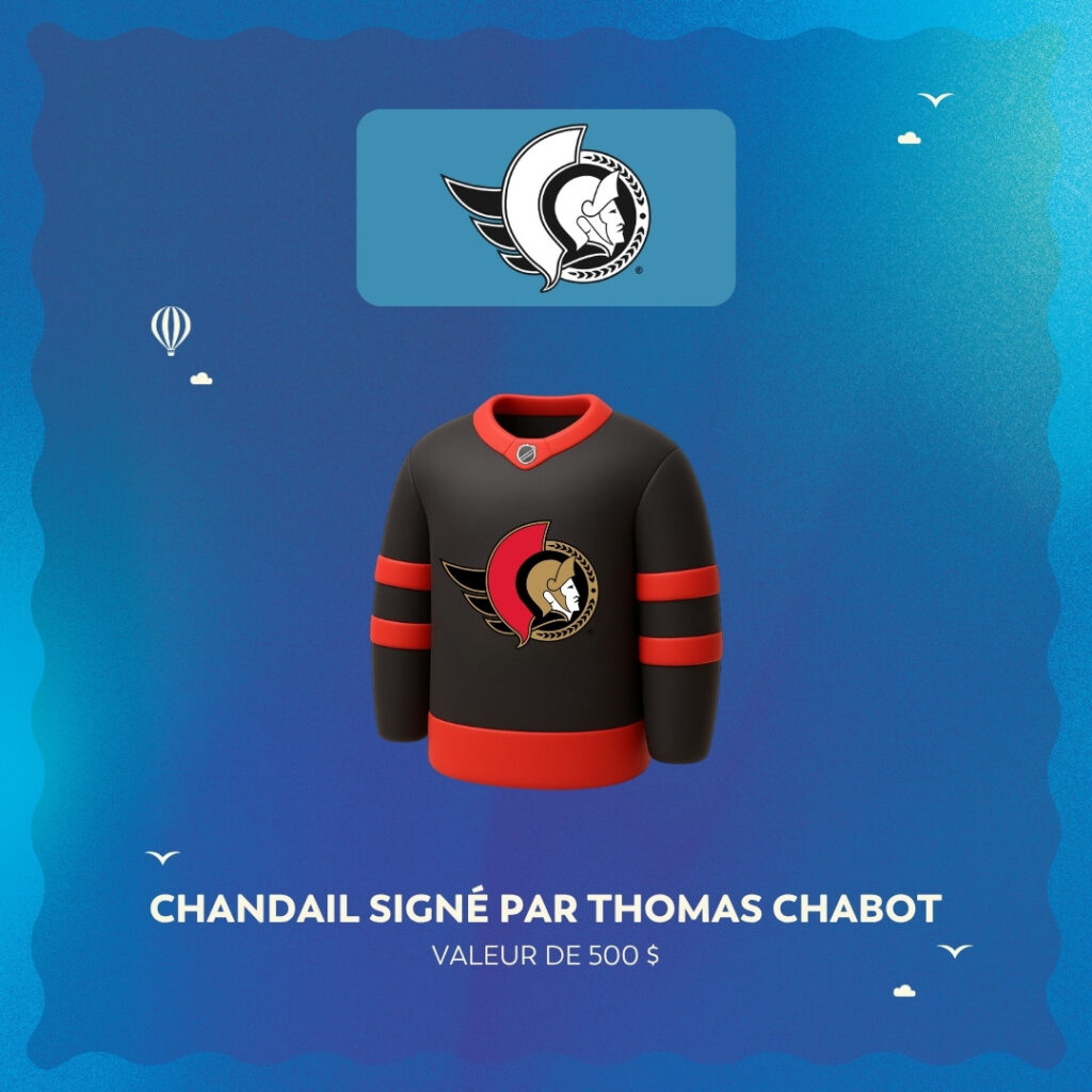 - Le 5e billet tiré donnera droit au cinquième prix, soit un (1) jersey des Sénateurs signé par Thomas Chabot. Valeur de 500 $.
