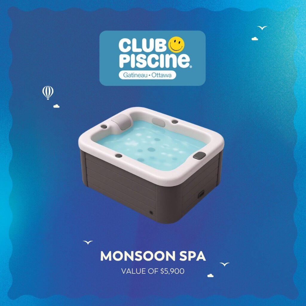 - The 2nd ticket drawn will entitle the winner to the second prize, namely one (1) Monsoon spa, 2025 model, graphite colour, featuring six (6) seats, including the captain’s seat, and one (1) ergonomic lounger allowing two reclining positions and a resting seat (a cover lifter and spa steps are included), courtesy of Club Piscine. Value of $5,900 + taxes.