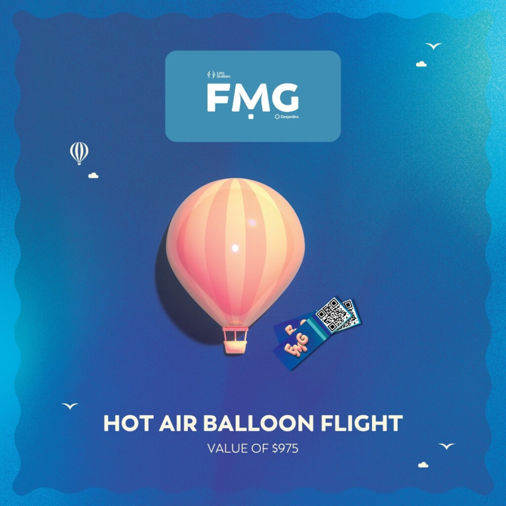 - The 3rd ticket drawn will entitle the winner to the third prize, namely one (1) hot air balloon ride for 2 people during the FMG 2026, including two (2) 5-day passes for the FMG. Value of $975 + taxes. If the flight cannot take place in 2026, this prize will be honoured during the 2027 edition of the FMG;