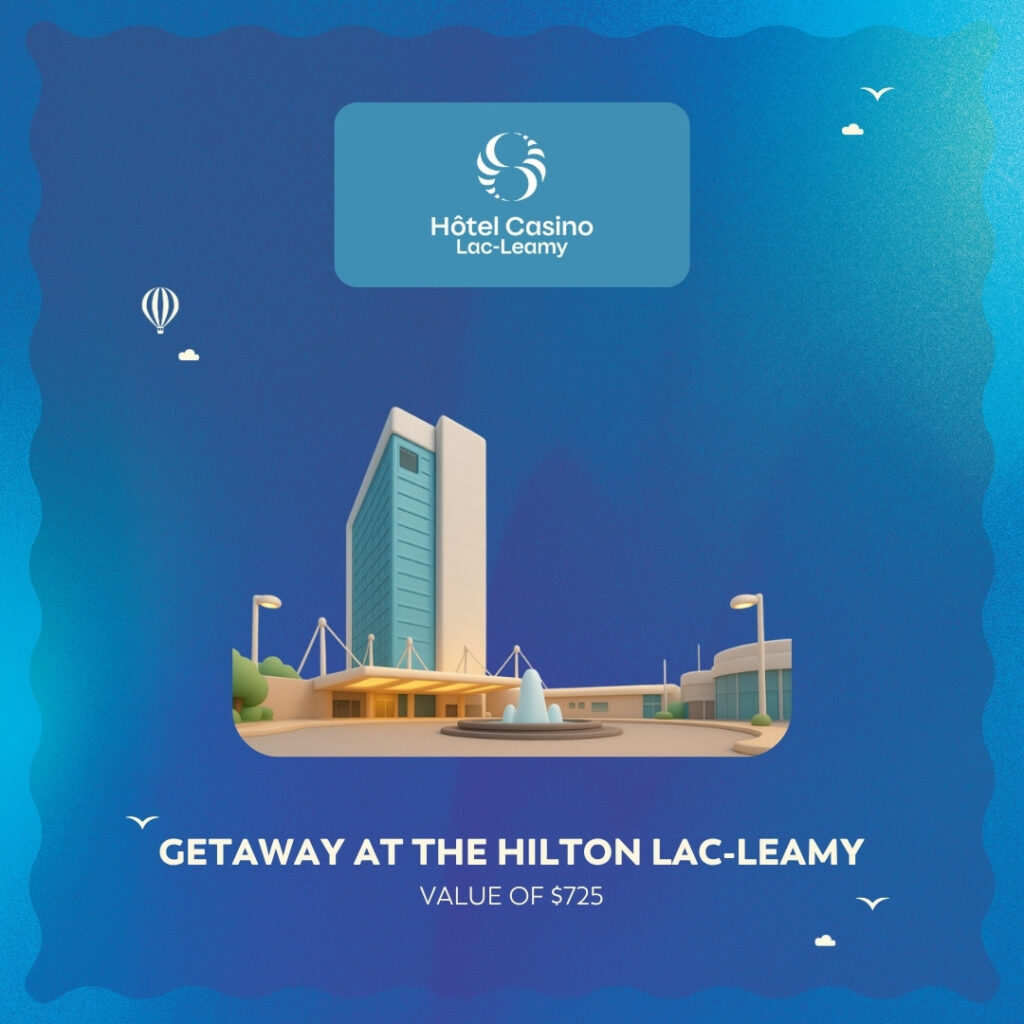 - The 2nd ticket drawn will entitle the winner to the second prize, namely one (1) night at the Hilton Lac-Leamy hotel in Gatineau and thirteen (13) $25 gift certificates redeemable at Loto-Québec bars, restaurants, shows, and accommodations. Value of $725;
