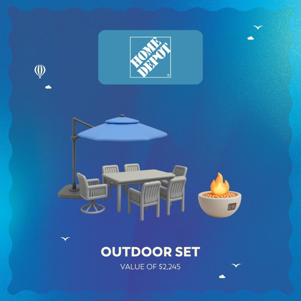 - The 6th ticket drawn will entitle the winner to the sixth prize, namely one (1) outdoor dining set, courtesy of Home Depot, including one (1) 3.35-metre offset aluminum patio umbrella with solar light bars, blue, by Hampton Bay, one (1) seven (7)-piece wicker patio dining set with brown cushions by Hampton Bay, and one (1) 91.4 cm gas patio fire pit by Hampton Bay. Value of $2,245 + taxes.