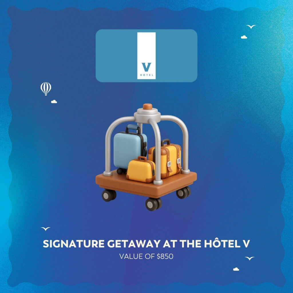 - The 1st ticket drawn will entitle the winner to the first prize, namely one (1) signature getaway at Hôtel V including two (2) nights in an urban king room, one (1) $130 gift certificate for Resto Bistro Rumeur, two (2) $50 gift cards for Tutti Frutti breakfast, as well as one (1) Hôtel V signature gift. Value of $850;